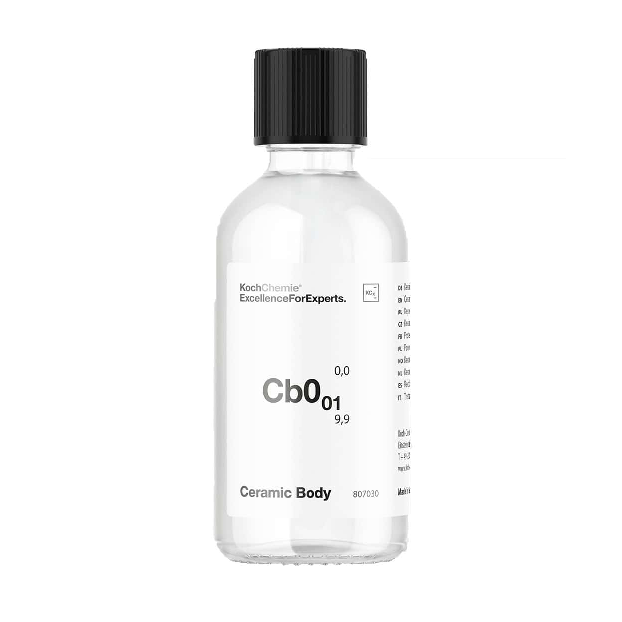 Ceramic Body Cb0.01 е високо технологично керамично покритие, от последно поколение, с много голяма твърдост и високи хидрофобни свойства приложимо върху много повърхности с цел тяхната защита. След полагане се образува тънък постоянен слой който се свързва посредством химическа реакция с повърхността. Реакцията започва от влажността на въздуха. Постоянна твърдост се получава на деветият ден след нанасянето. Това керамично покритие придава особен хидрофобен и перлен ефект. С формулата „почисти лесно“ третираните повърхности се почистват лесно дори на ръка . Покритието е устойчиво на алкални и киселинни препарати за измиване.