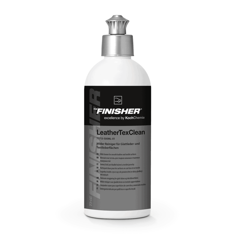 LeatherTexClean е готов за употреба почистващ препарат, от луксозната серия The Finisher на Koch Chemie, предназначен за качествено почистване на всички видове боядисана гладка кожа и текстил. LeatherTex Clean премахва замърсяванията деликатно, без да уврежда кожата или плата.