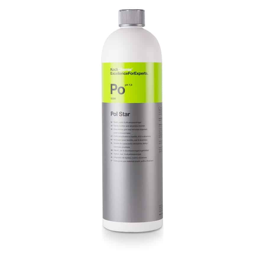 Koch Chemie – Po-Pol Star -Е eфективен, неутрален почистващ препарат за почистване на кожа, алкантара и всякакъв вид текстил. Благодарение на фината структура на състава, частиците от мръсотия се извличат от дълбините на влакната и могат да бъдат отстранени с мокра и суха прахосмукачка или изтрити с влажна кърпа. Не оставя водни ивици и осигурява запазването на оригиналната импрегнация. Съставът надеждно запазва нишките на тъканите и в последствие не позволява замърсявания да проникват в тях, което ги прави лесни за почистване при последващо замърсяване. Добър за почистване и консервиране покриви от мек плат при автомобилите тип „кабриолет“. Ефективен е, както при използване за пране с прахосмукачка, така и за екстрактор машини и за ръчно почистване с микрофибърна кърпа. Поради неутралното си pH- 7,0, Pol Star е безопасен за почистване на интериора на автомобила, като оставя и приятен, свеж аромат.