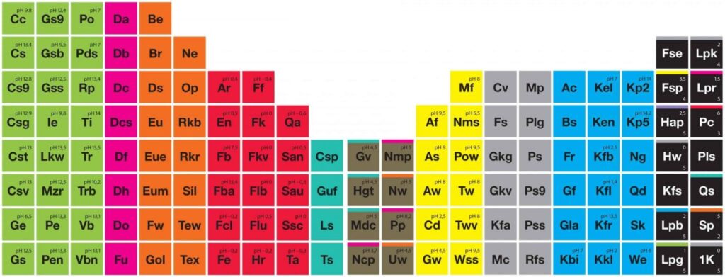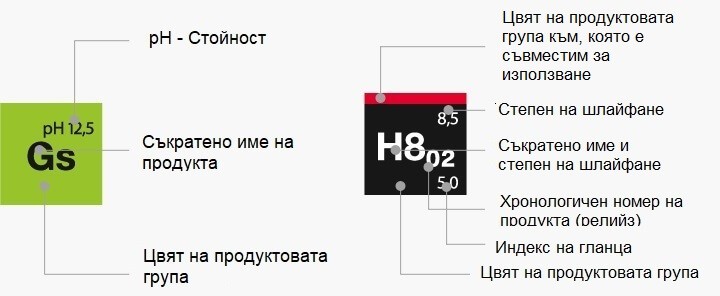 Всички продукти са част от една от десетте групи продукти. Всяка група продукти има различен цвят за по-бърз избор. Този цвят може да се намери на етикета на самия продукт. Съкратеното име на продукта,включва и номера и индекси с допълнителна информация за продукта.